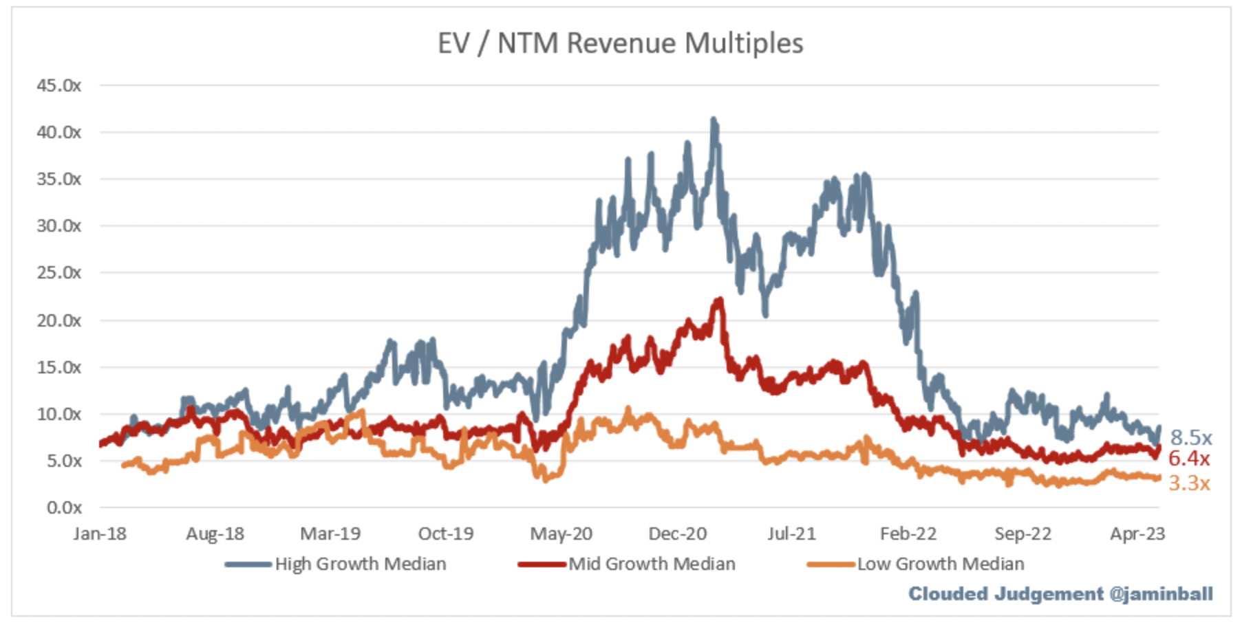 Economist Alfred Rappaport educated me early in my career and explained that revenue multiples are a shorthand valuation framework. Given that most software companies are not profitable, or at least not generating meaningful Free Cash Flow (“FCF”), it is, however, the only metric to compare the entire industry against. The promise of SaaS is that growth in the early years leads to profits in the mature years. SaaS multiples are calculated by taking the Enterprise Value (market cap + debt – cash) / NTM revenue. Jamin Ball – check out his Clouded Judgement newsletter – considers high growth (>30% projected NTM growth), mid-growth (15%-30%), and low growth (<15%). The median has come down considerably over the last 18 months: